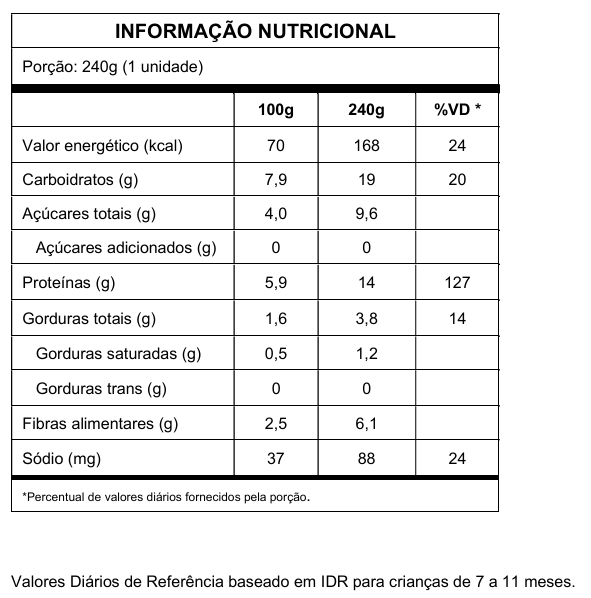 - Praticidade: pronta para consumo após simples descongelamento, facilitando o dia a dia dos pais.