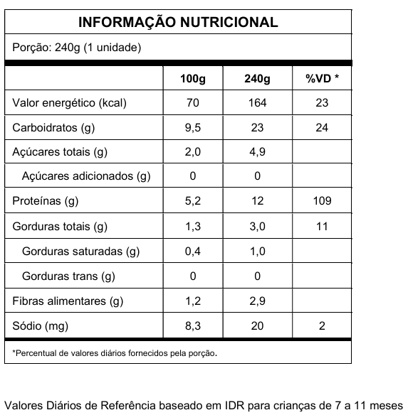- Praticidade: pronta para consumo após simples descongelamento, facilitando o dia a dia dos pais.