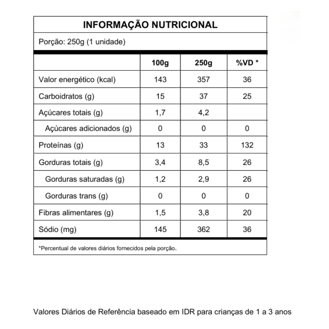 - Praticidade: porção ideal para facilitar a rotina das famílias, servindo refeições completas e nutritivas.