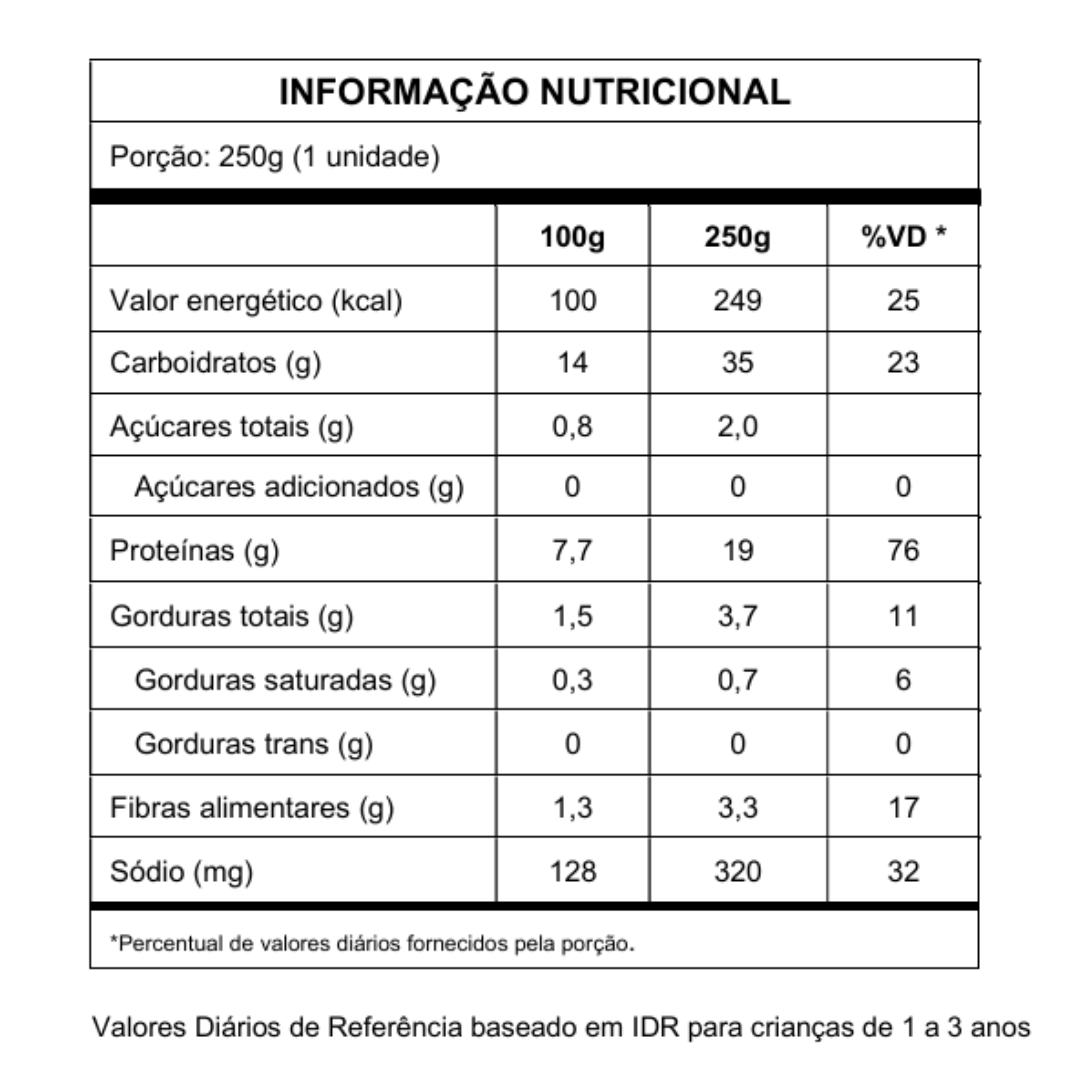 - Praticidade: porção ideal que facilita a rotina das famílias, garantindo uma refeição completa e nutritiva.